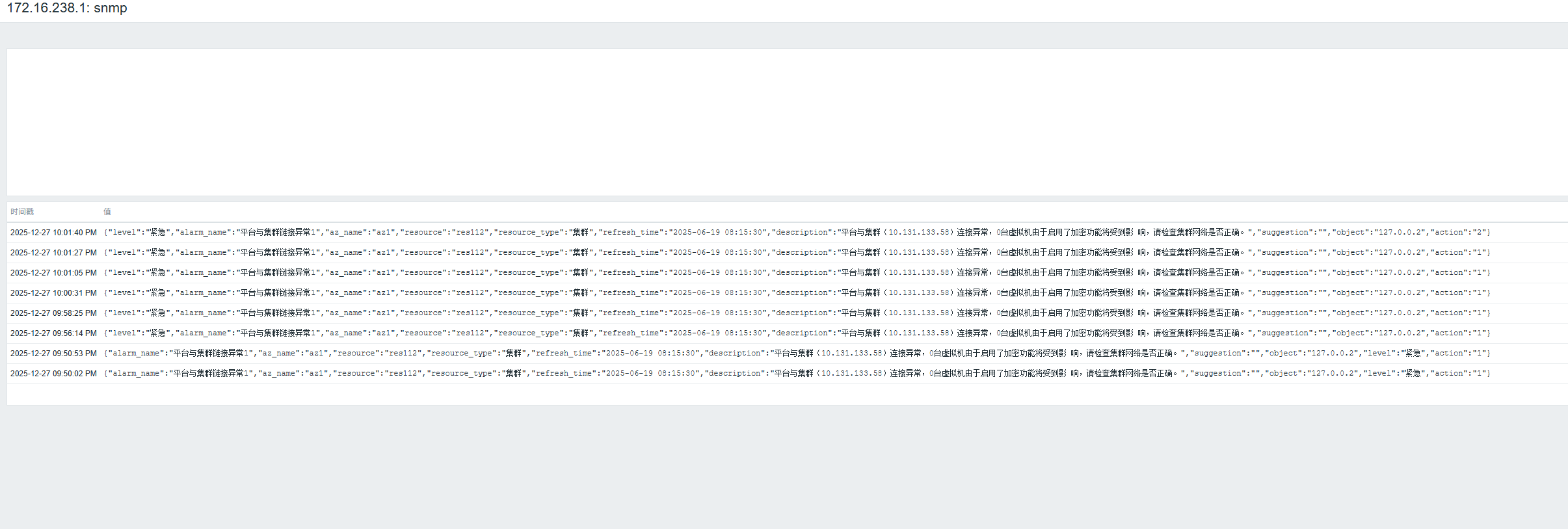Zabbix Snmptrap 告警配置 zabbix 配置SNMPTRAP告警触发器1,接收到告警信息2025-12-27 05:10:45 PM 2025-12-27T09:10:43+0000 UDP: [172.16.238.1]:40746->[172.16.238.4]:1162 DISMAN-EVENT-MIB::sysUpTimeInstance = 0 SNMPv2-MIB::snmpTrapOID.0 = PLATFORM-ALARM-MIB::cloudPlatformAlarm PLATFORM-A... 作者: Dean0731 时间: 2025-12-27 分类: 评论